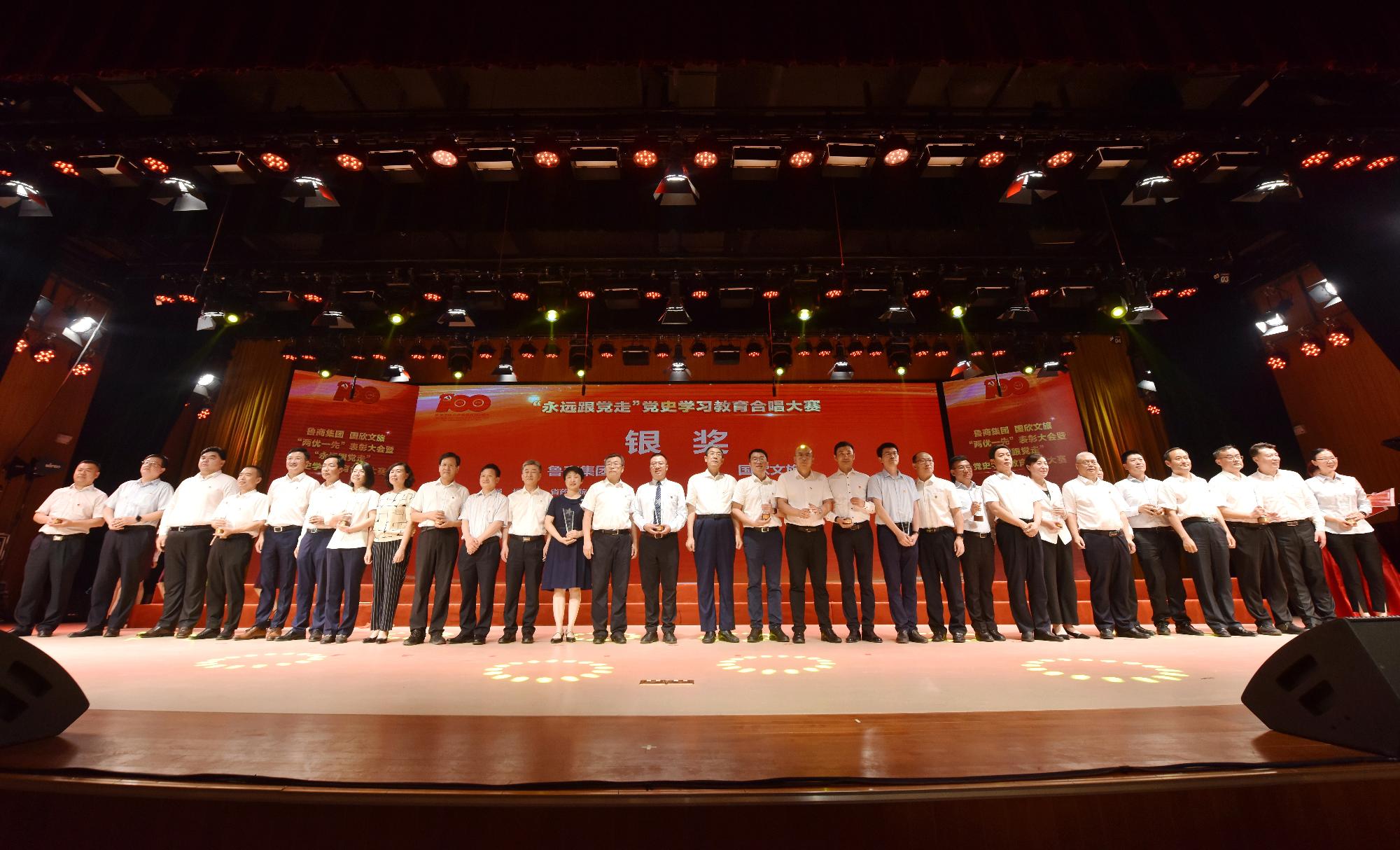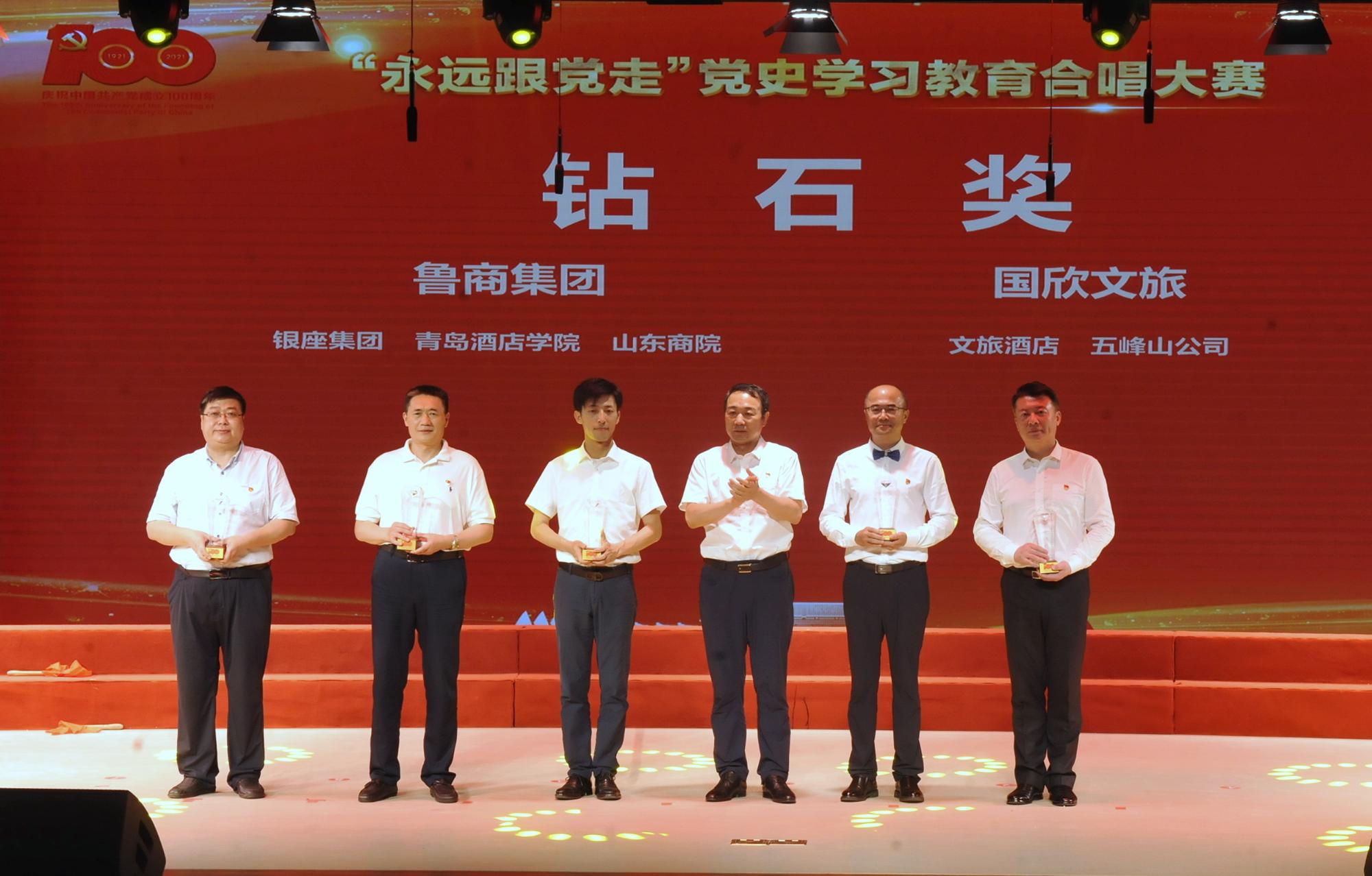 在隨后舉行的“永遠(yuǎn)跟黨走”黨史學(xué)習(xí)教育合唱大賽總決賽環(huán)節(jié),晉級(jí)決賽的9支參賽隊(duì)伍為現(xiàn)場(chǎng)觀眾帶來了一場(chǎng)精彩絕倫的視聽盛宴。經(jīng)過激烈角逐,最終銀座集團(tuán)、青島酒店學(xué)院、山東商院3個(gè)單位獲得“鉆石獎(jiǎng)”,7個(gè)單位獲得“金獎(jiǎng)”,13個(gè)單位獲得“銀獎(jiǎng)”。魯商集團(tuán)離退休中心獲得特殊貢獻(xiàn)獎(jiǎng)。