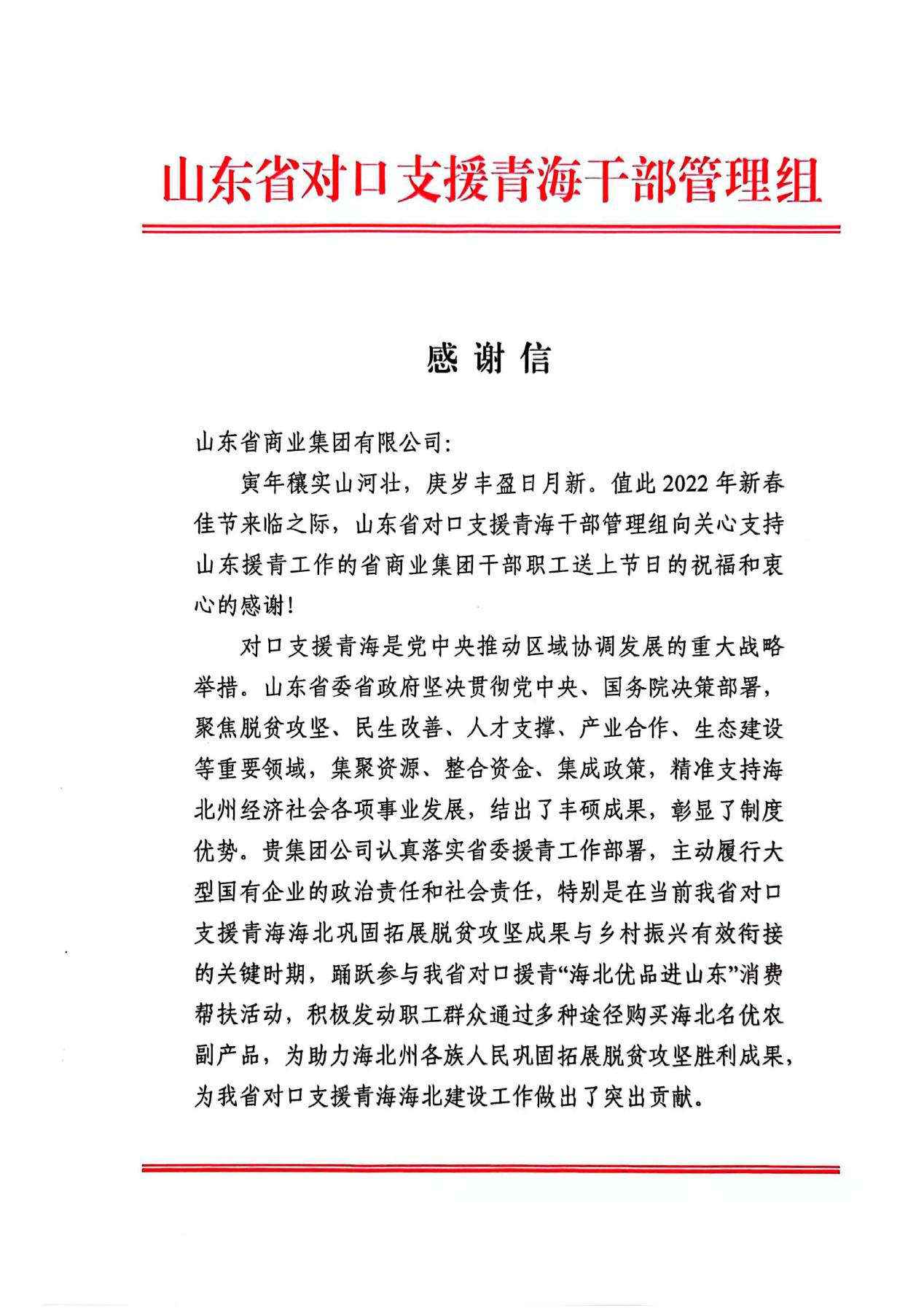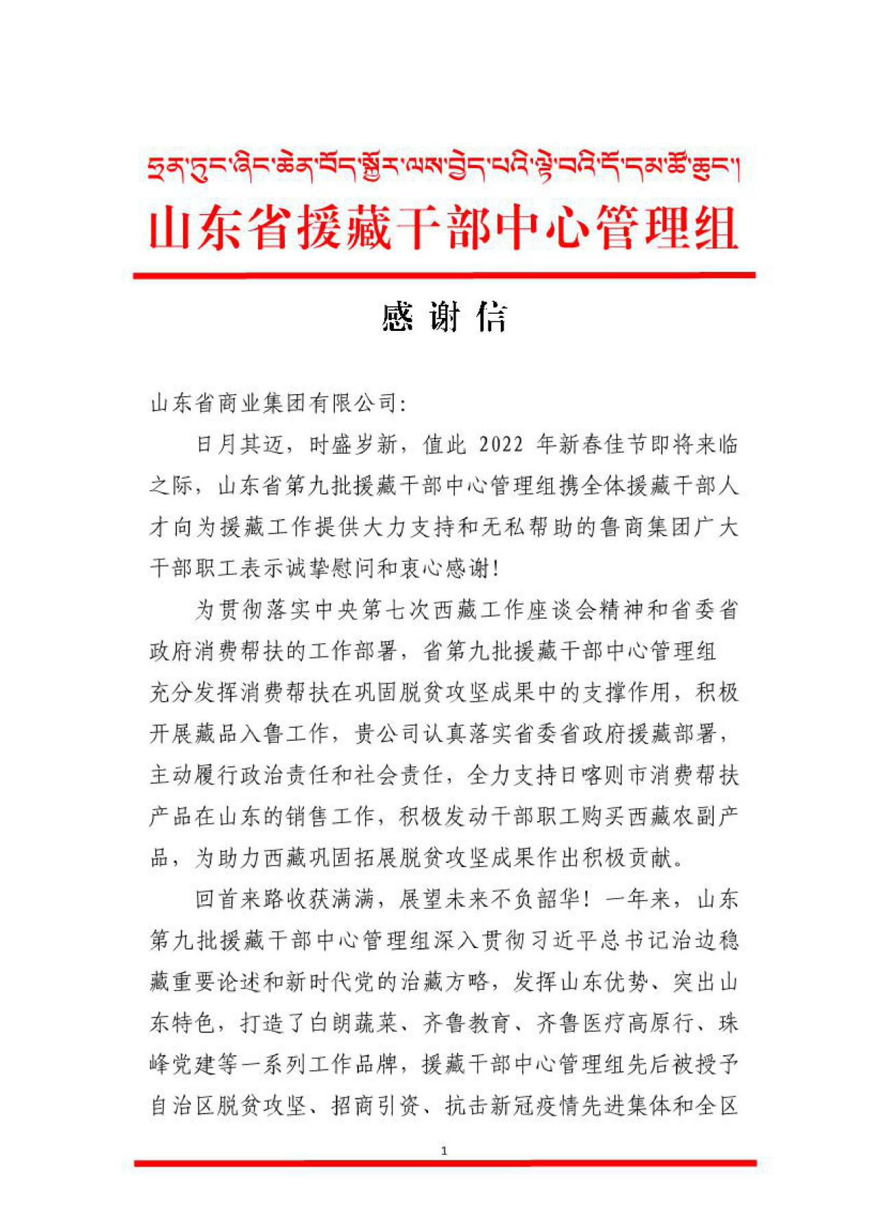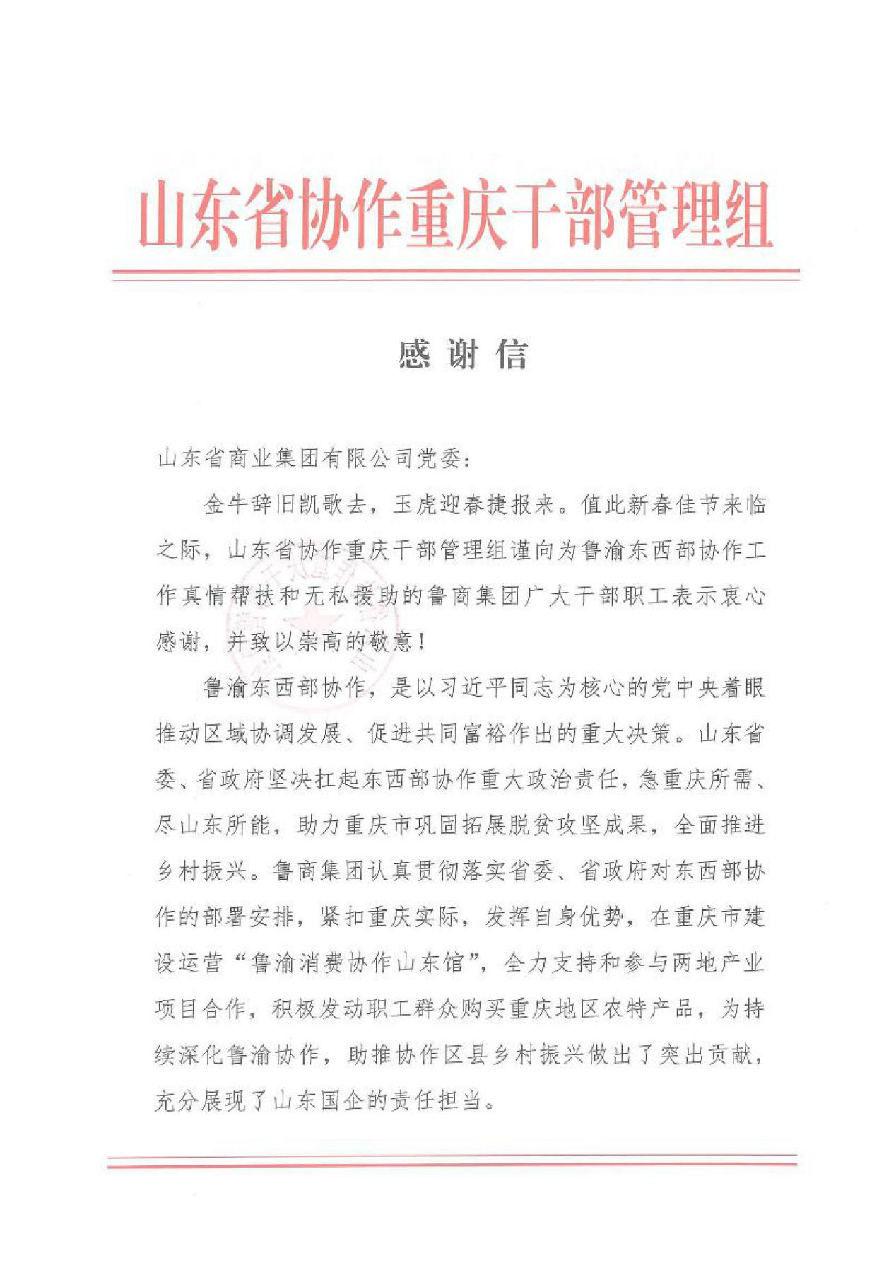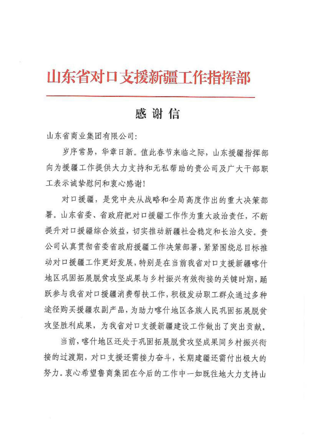 近日,魯商集團(tuán)分別收到山東省對口支援新疆工作指揮部、山東省第九批援藏干部中心管理組、山東省對口支援青海干部管理組、山東省協(xié)作重慶干部管理組、山東省協(xié)作甘肅干部管理組發(fā)來的感謝信,對集團(tuán)近年來在對口支援和東西部協(xié)作工作中給予的支持和幫助表示肯定和感謝。