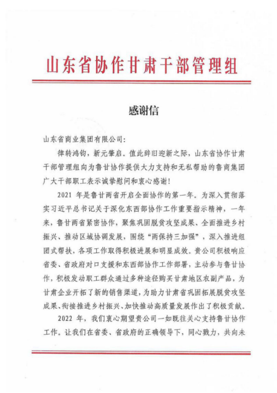 感謝信中表示,魯商集團(tuán)認(rèn)真貫徹省委、省政府對對口支援和東西部協(xié)作工作的部署安排,緊緊圍繞總目標(biāo)推動支援協(xié)作工作更好發(fā)展,踴躍參與我省對口支援消費(fèi)幫扶工作,主動履行政治責(zé)任和社會責(zé)任,積極發(fā)動職工群眾通過多種途徑購買幫扶地區(qū)農(nóng)副產(chǎn)品,為助力西部地區(qū)人民鞏固拓展脫貧攻堅勝利成果,助推協(xié)作區(qū)縣鄉(xiāng)村振興,為我省對口支援西部地區(qū)建設(shè)工作作出突出貢獻(xiàn)。