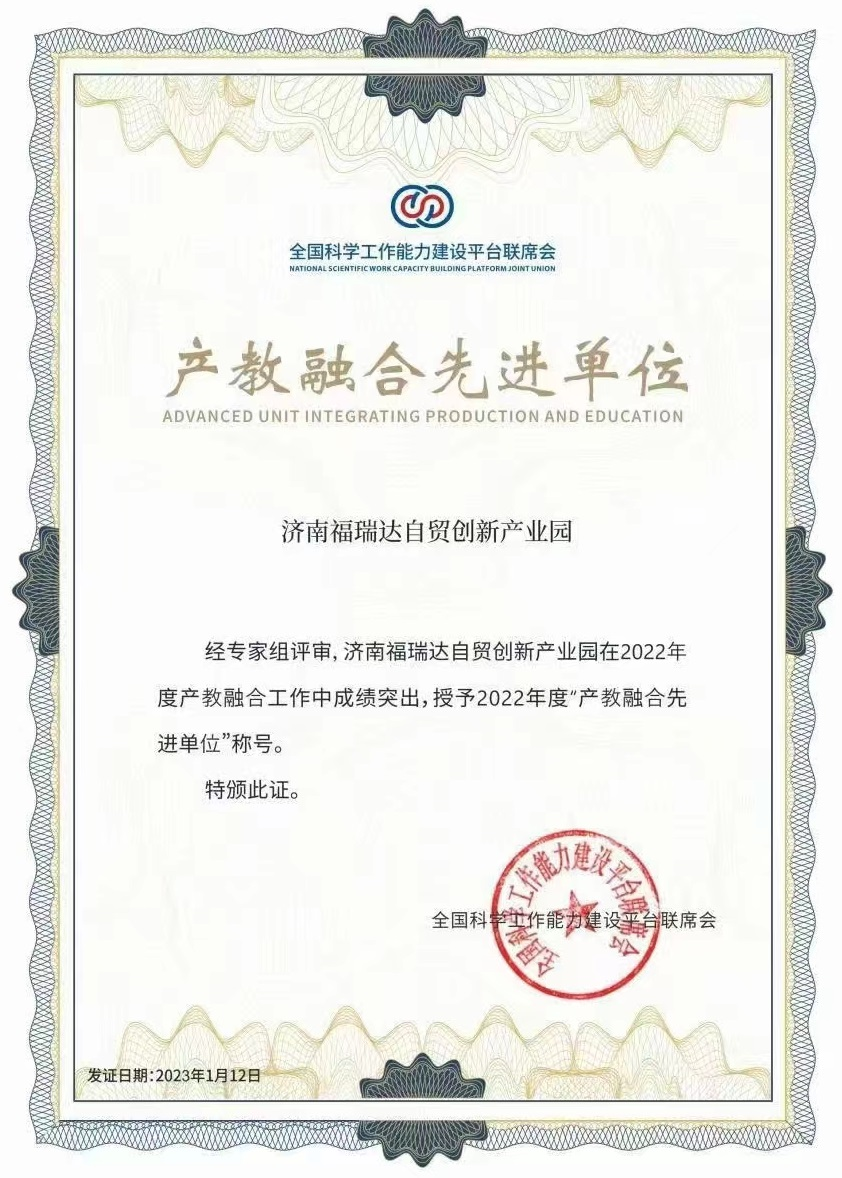 近日,濟啤集團福瑞達自貿創(chuàng)新產業(yè)園被全國科學工作能力建設平臺聯(lián)席會授予2022年度“產教融合先進單位”榮譽稱號。